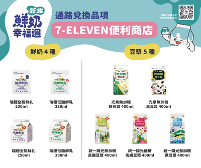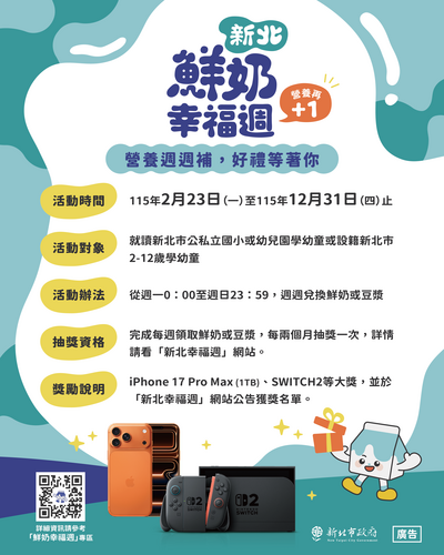 新北鮮奶幸福週自115年2月23日起設籍或就讀新北2-12歲學幼童每週免費喝1瓶鮮奶。
