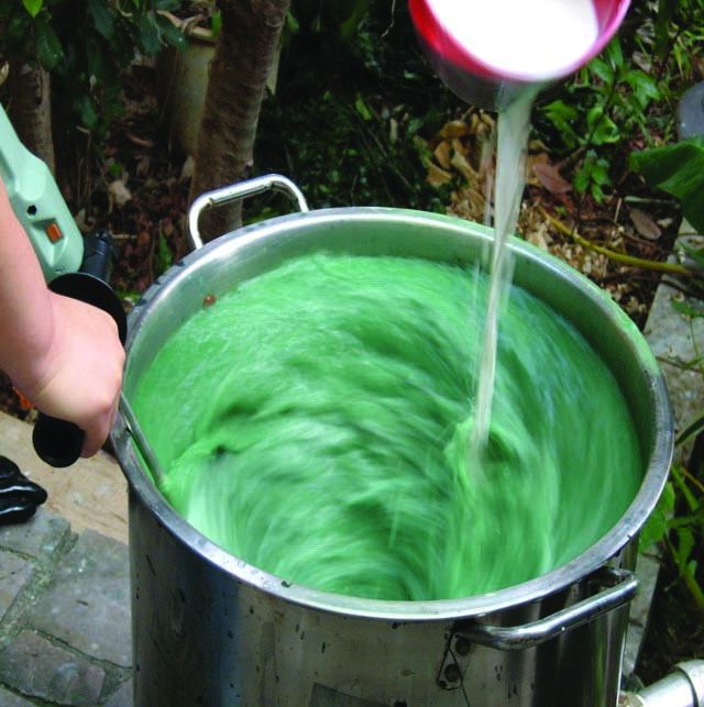 藍染流程:藍泥發酵還原成染液→布料【浸泡染色→染後絞乾→晾晒氧化〈反複數次〉】→充份水洗→量晾晒完成