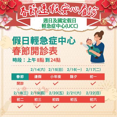 (2)週日及國定假日輕急症中心(UCC)春節開診時段為2月14日至2月15日、2月17日至2月20日及2月22日的上午8點到24點。