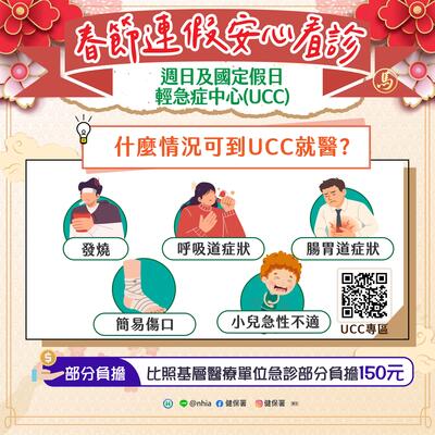 衛生福利部中央健康保險署宣導「春節期間輕急症中心UCC開診時段及服務院所」